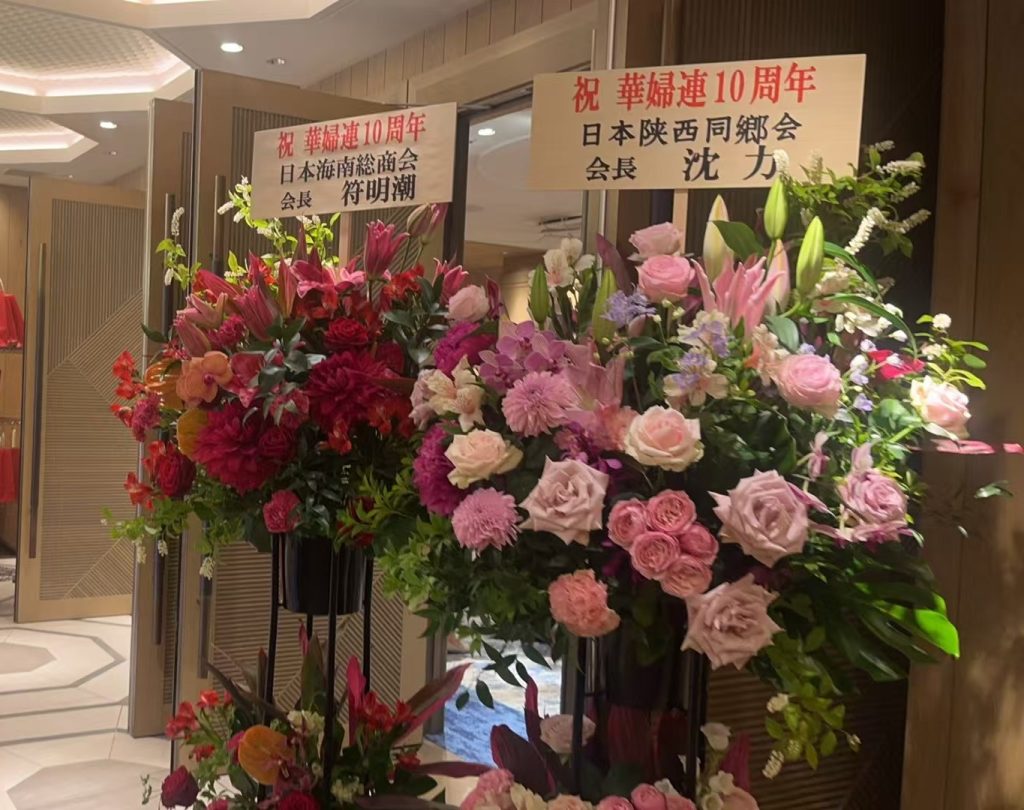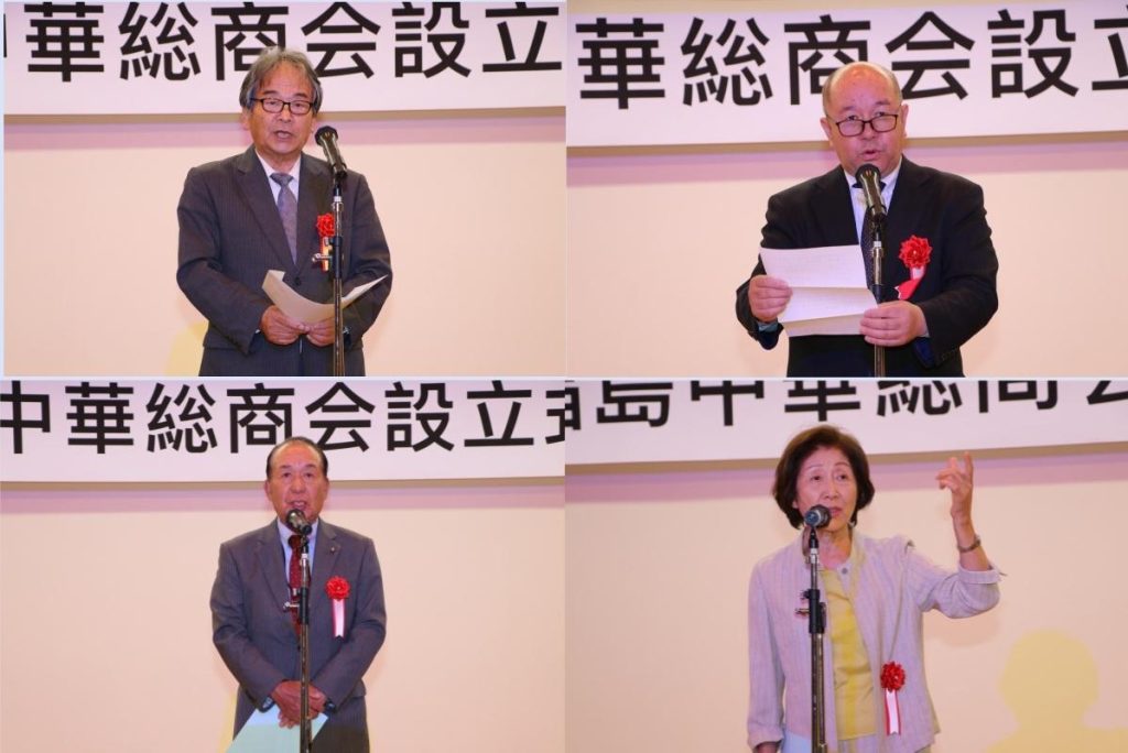 日中友好技術人材交流協会最高顧問の梅木様および他の3人の来賓からお祝いのお言葉をいただきました。また,ウクライナ,韓国,マレーシア,フィリピンと中国の華僑華人団体から多くの祝電をいただきました。日本国内の華僑華人団体や関係企業からも祝電をいただきました。